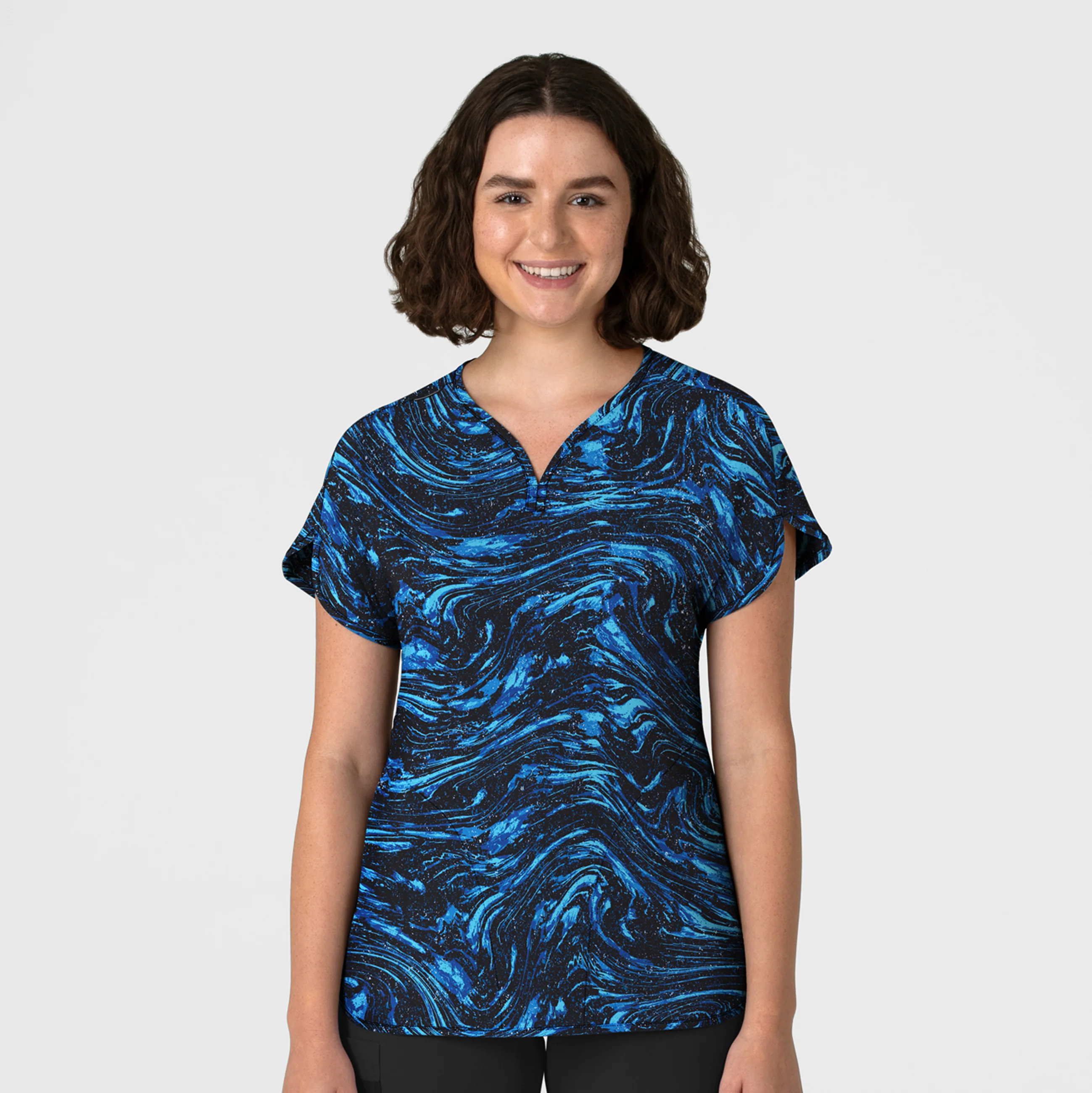 The Wink Women's Dolman Print Scrub Top is designed to let your unique personality shine, making those long shifts feel a little brighter. The Y-neck and sophisticated dolman sleeves with binding details add a touch of elegance to your everyday workwear. Crafted from a polyester blend that incorporates recycled materials, this scrub top not only looks good but also does good for the planet. It's a choice that lets you leave a lighter footprint on our beautiful Earth. But that's not all – the stretchy fabric ensures that you can move freely and comfortably, so you can focus on what really matters: your patients. With features like the Y-neck, shoulder badge loop, two side entry pockets, binding finish at the dolman sleeve hem, and side vents at the hem, this scrub top is as practical as it is stylish. Stay comfortable, eco-conscious, and chic on the job with Wink.