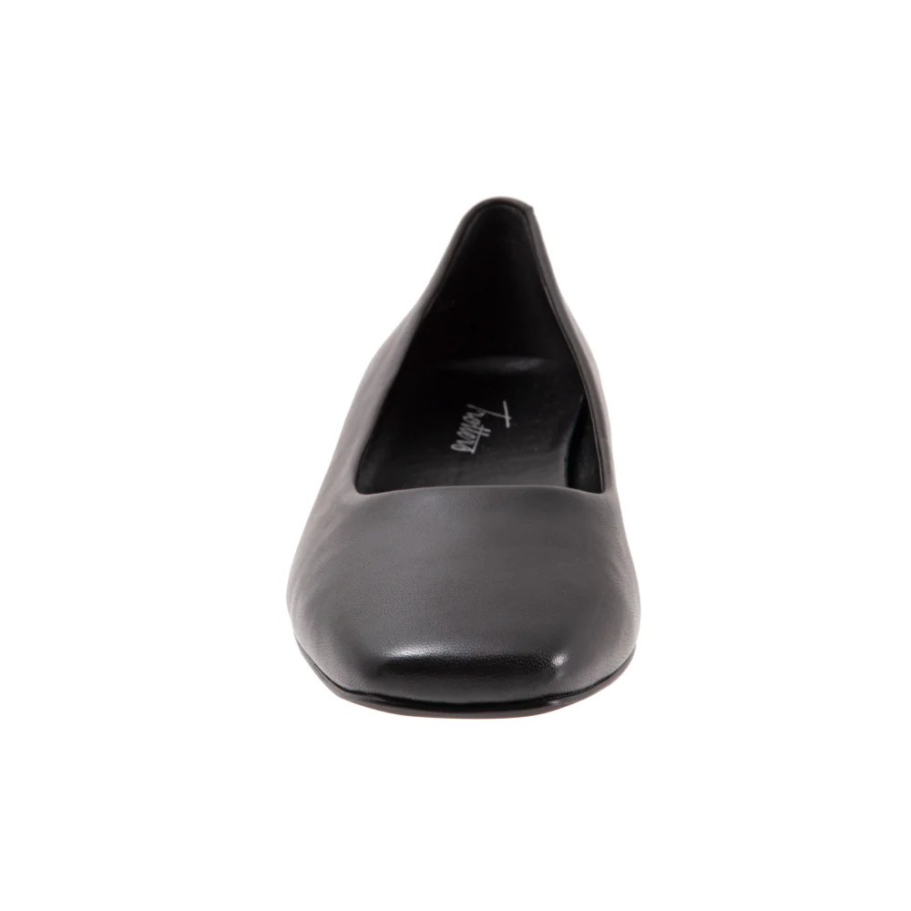 Honor makes a statement with its square toe and skimmer style. A wonderfully cushioned footbed and flexible rubber sole with low stacked heel finish off this beautiful flat.