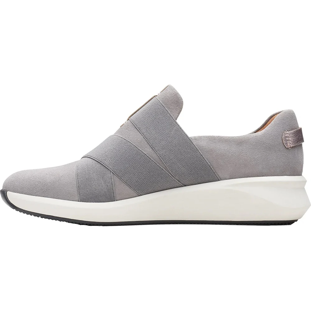 For comfort and sleek design this sports-casual slip-on is a go-to style.The Clarks Un Rio Strap is a casual women's suede sneaker with an adjustable elastic strap and stylish snake print upper.